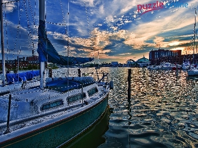 Niebo, Budynki, Jezioro, Łodzie, Chmury