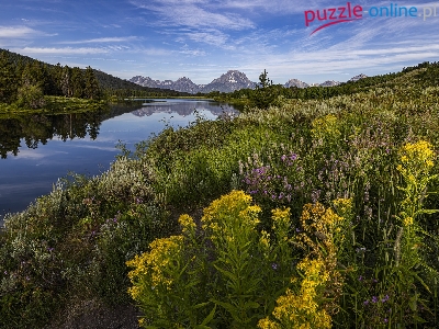 Łąka, Stany Zjednoczone, Rzeka, Góry, Mount Moran, Park Narodowy Grand Teton, Kwiaty, Rośliny, Wyoming, Snake River, Niebo