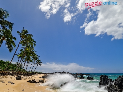Skały, Hawaje, Plaża, Niebo, Morze, Maui, Palmy