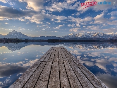 Niebo, Góry, Jezioro, Pomost, Chmury