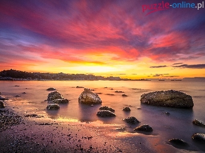Puzzle Niebo, Morze, Zachód słońca, Kamienie
