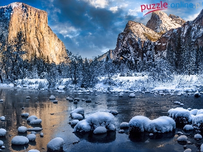Kamienie, Chmury, Merced River, Śnieg, Drzewa, Niebo, Zima, Kalifornia, Stany Zjednoczone, Park Narodowy Yosemite, Góry, Rzeka