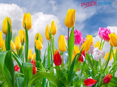 Puzzle Niebo, Kolorowe, Tulipany, Chmury