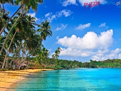 Niebo, Morze, Plaża, Wybrzeże, Palmy