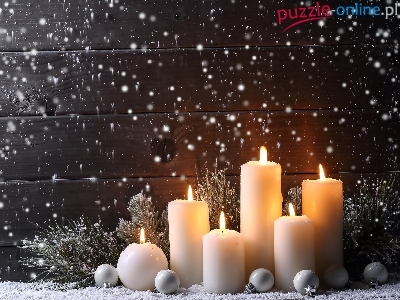 Śnieg, Bombki, Świąteczna, Świece, Gałązka, Kompozycja