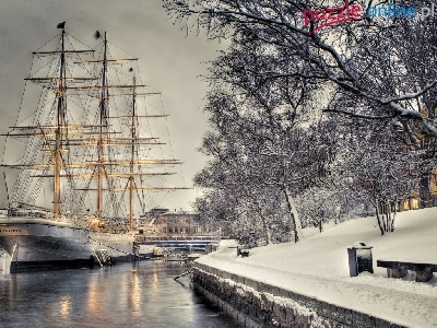 Śnieg, Morze, Drzew, Zaglowiec, Brzeg, Konary