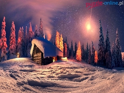 Śnieg, Noc, Blask, Drzewa, Zima, Domek, Księżyc