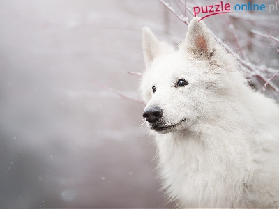 Mordka, Śnieg, Pies, Biały owczarek szwajcarski, Gałązki