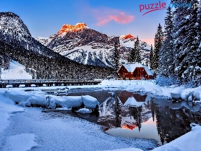 Śnieg, Rzeka, Dom, Las, Zima, Góry, Most