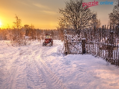 Ogrodzenie, Śnieg, Promienie słońca, Zima, Traktor, Drzewa