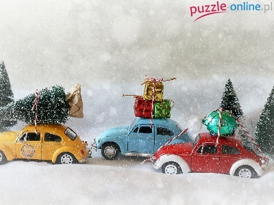 Śnieg, Choinki, Boże Narodzenie, Autka, Prezenty, Zima