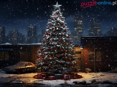 Noc, Śnieg, Domy, Choinka, Bombki, Samochód, Boże Narodzenie, Prezenty