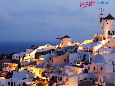 Noc, Grecja, Wiatraki, Domy, Santorini