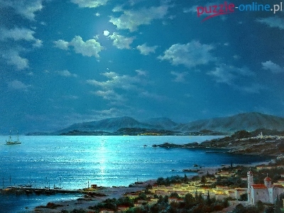 Puzzle Noc, Morze, Góry, Miasteczko