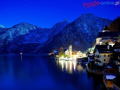 Noc, Hallstatt, Zima, Austria, Góry, Światła