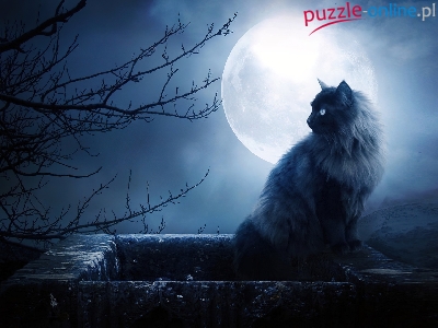 Noc, Drzewa, Kot, Komin, Księżyc