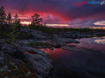 Skały, Rosja, Ładoga, Noc, Jezioro, Karelia, Drzewa