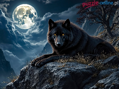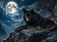 Chmury, Czarny, Niebo, Noc, Skała, Wilk, Księżyc