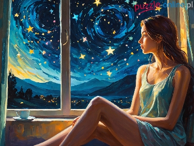 Kobieta, Noc, Okno, Niebo, Gwiazdy