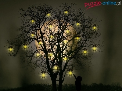 Noc, Fantasy, Drzewo, Światełka, Księżyc