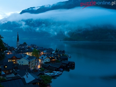 Noc, Chmury, Austria, Jezioro, Zabudowania, Hallstatt