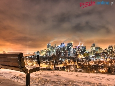 Śnieg, Zima, Miasto, Nocą, Ławka
