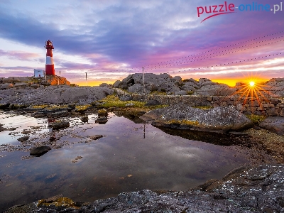 Chmury, Latarnia morska Eigeroy, Promienie słońca, Norwegia, Skały, Wybrzeże, Gmina Egersund