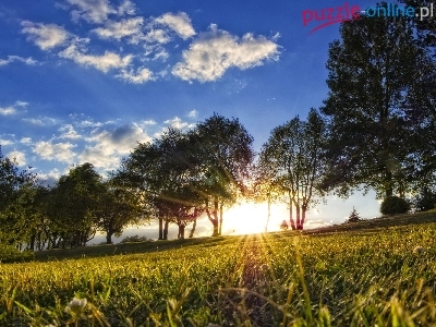 Obłoki, Słońca, Łąka, Drzewa, Promienie