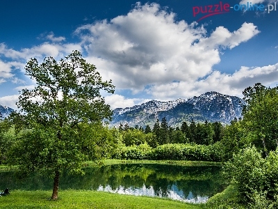 Obłoki, Las, Drzewa, Góry, Jezioro, Łąka