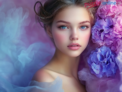 Hortensje, Niebieskie, Dziewczyna, Oczy, Grafika, Kwiaty
