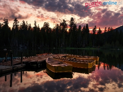 Łódki, Stany Zjednoczone, Odbicie, Zachód słońca, Jezioro, Kalifornia, Mammoth Lakes, Pomost, Drzewa, Wzgórza