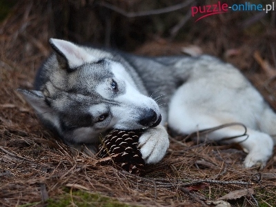 Puzzle Odpoczynek, Pies, Husky, Szyszka