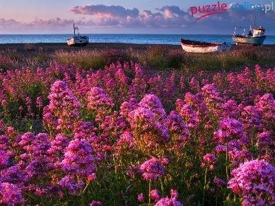 Łąka, Wybrzeże, Łodzie, Kwiaty