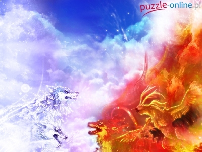 Ogień, Feniks, Walka, Lód, Wilki