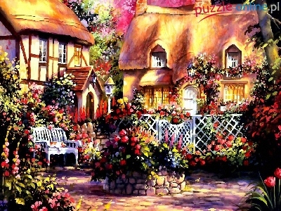 Puzzle Ławka, Domy, Ogród, Kwiaty
