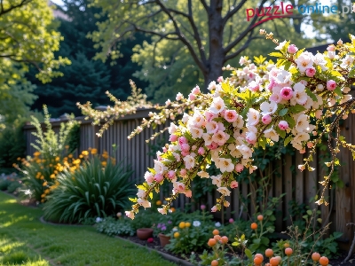 Puzzle Kwiaty, Ogród, Drzewo owocowe, Płot