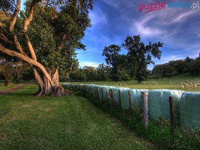 Puzzle Ogrodzenie, Niebo, Drzewa, Owce