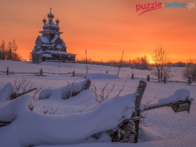 Obwód archangielski, Rosja, Ogrodzenie, Cerkiew, Włodzimierskiej Ikony Matki Bożej, Drzewa, Żerebcowa Góra, Zima