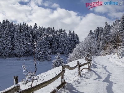 Puzzle Ogrodzenie, Zima, Drzewa, Åšnieg