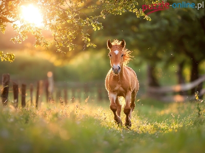 Galop, Maść kasztanowata, Koń, Trawa, Słoneczny blask, Ogrodzenie