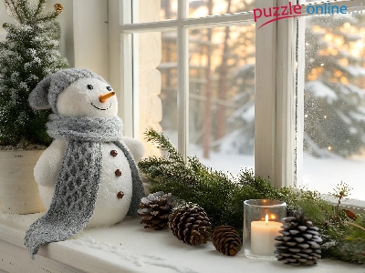 Zima, Okno, Bałwan, Świeca, Szyszki