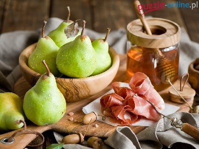 Widelec, Szynka, Kompozycja, Gruszki, Jedzenie, Miska, Deska, Zielone, Miód, Żołędzie