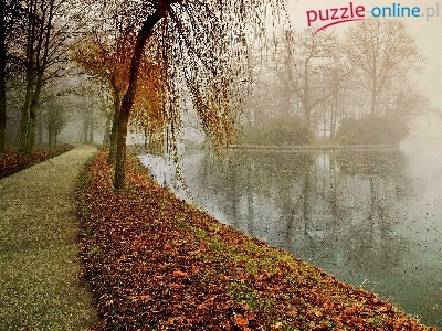 Staw, Droga, Jesień, Mgła, Liście, Most, Park, Wyspa, Opadłe
