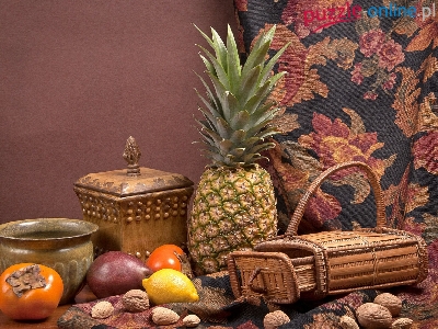 Orzechy, Ananas, Naczynia, Kompozycja, Cytryna, Koszyk