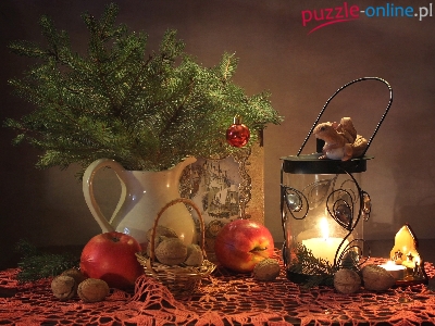 Gałązki, Świąteczna, Jabłka, Koszyczek, Świeczka, Lampion, Kompozycja, Bombka, Orzechy