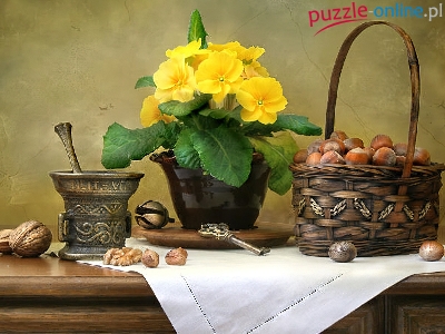 Orzechy, Serweta, Prymule, Biała, Koszyk, Żółte