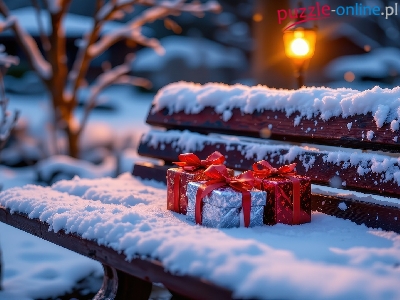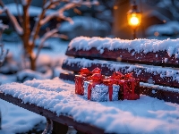 Prezenty, Noc, Zima, Ośnieżona, Latarnia, Ławka