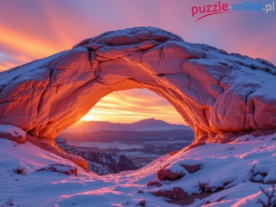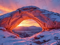 Wschód słońca, Skała, Ośnieżona, Zima, Łuk