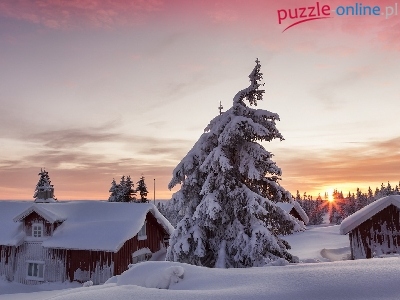 Gmina Lillehammer, Domy, Drzewa, Zachód słońca, Norwegia, Zima, Ośnieżone