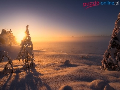 Jezioro, Drzewa, Zachód słońca, Gmina Ringerike, Zima, Zaśnieżone, Norwegia, Ośnieżone